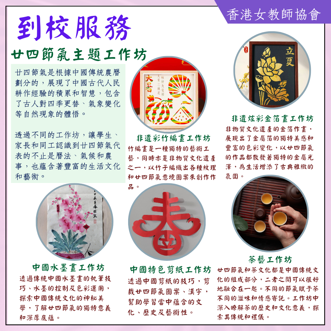本會多年來為全港幼稚園及中小學,提供到校服務,包括不同範疇的專業講座、 工作坊、興趣班 ,課外活動及課程等。自2009年推出以來,一直廣受學校歡迎。 我們按照學校需要,籌劃及配對相關專業人士。服務對象包括:教師、學生或家長。 查詢電話:27877311(楊小姐) |